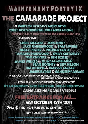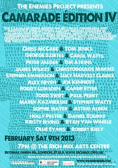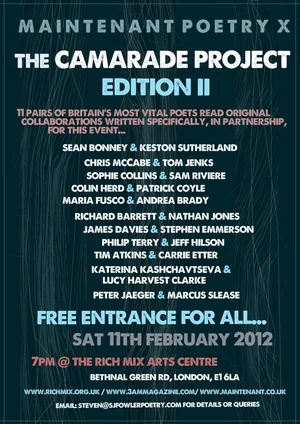 The Camarade series explores collaboration exclusively between poets, taking the form of events which pair writers to produce and premiere new collaborative poems or artworks, to be performed live. It has been the flagship Enemies project event, with multiple pairs at each reading, sharing their work in short bursts, drawing in large audiences, inculcating an open, communal and engaging aesthetic.