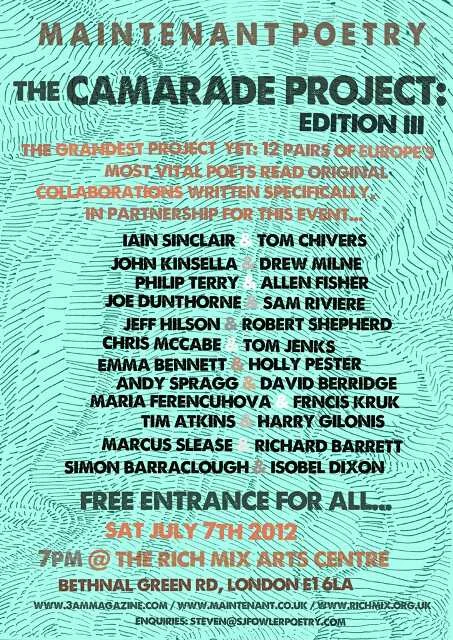 The third instalment of the Camarade series featured original poetry read by collaborating pairs of European poets. Featuring Iain Sinclair & Tom Chivers / Allen Fisher & Philip Terry / Jeff Hilson & Robert Shepherd / Chris McCabe & Tom Jenks / Tim Atkins & Harry Gilonis / Simon Barraclough & Isobel Dixon / Emma Bennett & Holly Pester